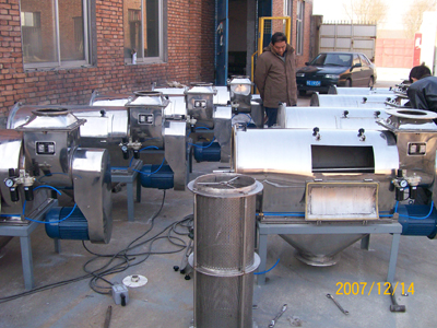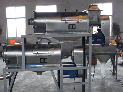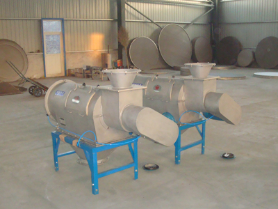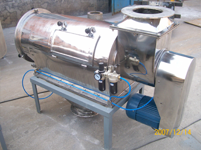 本設備篩網為圓筒狀,置于機體內,物料通過螺旋輸送系統后,和氣流混合、霧化進入網筒內;通過網筒內風輪葉片使物料同時受離心力和旋風推進力,從而迫使物料噴射過網,由細料排出口排出,不能過網的物料沿筒壁從粗料排出口排出。